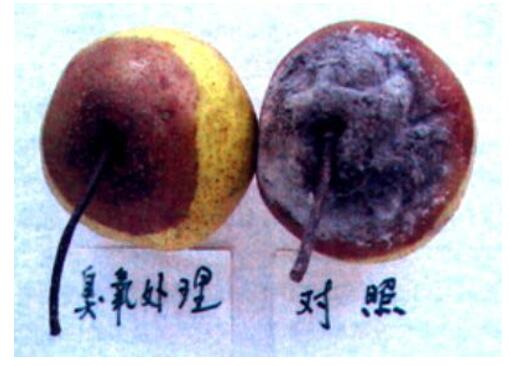 常溫下臭氧處理(左)和對照(右)的雪花梨的腐爛程度比較上圖顯示的是臭氧處理的雪花梨和對照果腐爛程度的比較,在上表中的腐爛果統計中它們肯定均屬于腐爛果,但是就其腐爛程度而言,兩者是有明顯區別的,經臭氧處理的雪花梨,其腐爛病斑的發展和病原菌絲體及孢子的形成均比對照果慢。