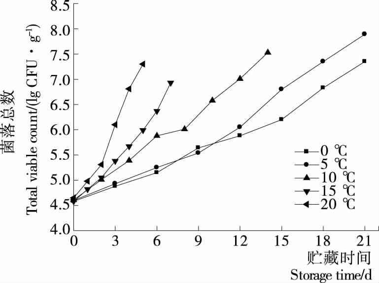 菌落總數能有效反映蔬菜在貯藏過程中的新鮮程度,直接影響到其能否食用,是評定樣品是否腐敗的重要因素。有研究[20]稱蔬菜菌落總數達到6 lg CFU/g時,該蔬菜即到達可食臨界點,當超過該臨界值則表明蔬菜處于腐敗狀態,失去正常食用價值。由圖1可知,在貯藏過程中,各溫度組菌落總數均呈現增長趨勢,可能是鮮切操作對組織結構造成了破壞,使得細胞內汁液流出,為細菌生長提供了營養物質和有利條件[21]。貯藏溫度越低安全食用期越長,如20 ℃樣品在第3天時便達到6.1 lg CFU/g,而0 ℃下菌落總數增速很緩,在貯藏第12天才到達5.88 lg CFU/g,這是因為溫度較低影響到微生物新陳代謝,從而延緩了微生物的生長[22],與王超等[23]使用不同溫度貯藏菠菜得到的結果相同,充分說明低溫能有效延緩細菌的滋生。