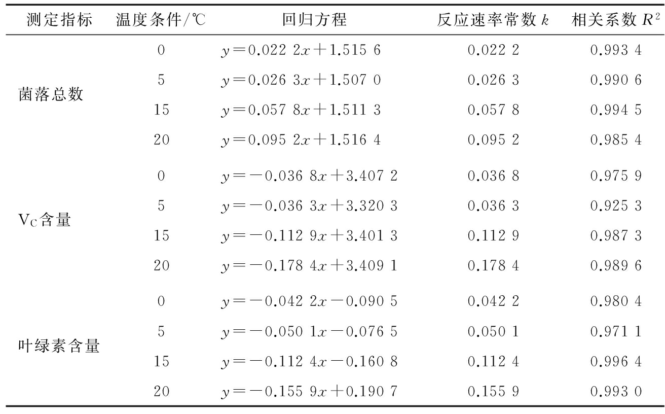 根據試驗設計,利用一級動力學模型結合Arrhenius方程,使用Origin軟件分別對0,5,15,20 ℃貯藏條件下鮮切杭白菜的菌落總數、VC含量、葉綠素含量指標進行線性回歸擬合,得到不同指標在不同貯藏溫度下的回歸方程,見表1。