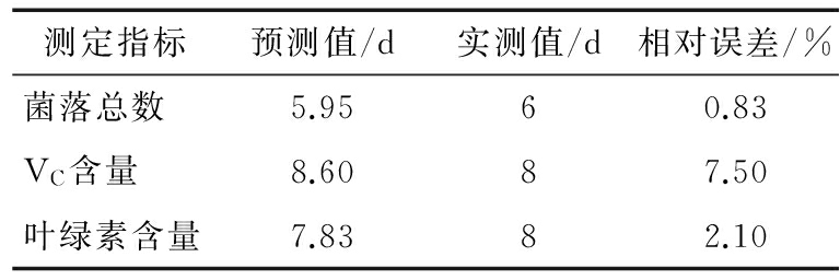 選取樣品在10 ℃條件下的貨架期實測值,驗證預測模型的準確性。由于國標中沒有規定蔬菜VC及葉綠素含量腐敗標準,因此本試驗采用感官不可接受值所得日期作為VC及葉綠素含量的貨架期終止日期,菌落總數以6 lg CFU/g為可食用標準,樣品菌落總數超過允許范圍即視為貨架期終止,貨架期實測值與預測模型求得的預測值見表2。