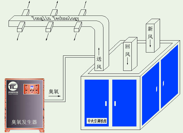 該系列臭氧發生器高濃度臭氧發生技術,放置于中央空調外,通過管道把臭氧加入中央空調送風系統,而使臭氧均勻的擴散到需要消毒的房間。